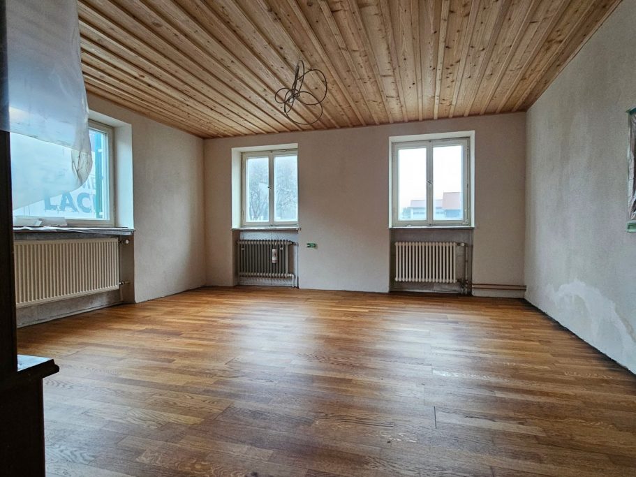 Der alte Eichenboden wurde geschliffen und geölt, sowie eine Holzdecke aus heimischer Lärche wurde eingebaut.