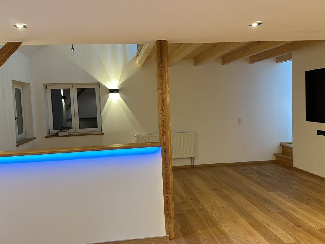 Umbau eines ehemaligen Heubodens zum Wohnzimmer mit Galerie.